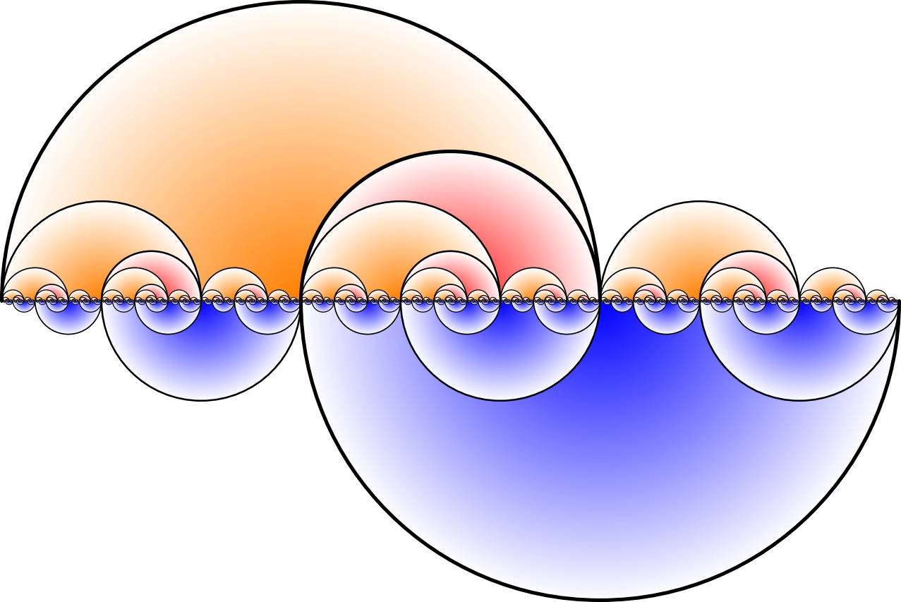 The Farey graph, shown on the left and surveyed on 300 pages in Hatcher’snew book (PDF version), plays a role in a number of mathematical fields ranging from group theory and number theory to geometry and dynamics. Curiously, graph theory has not been among these until very recently, when I showed that the Farey graph plays a central role in graph theory too: it is one of two infinitely edge-connected graphs that must occur as a minor in every infinitely edge-connected graph. Previously it was not known that there was any set of graphs determining infinite edge-connectivity by forming a minor-minimal list in this way, let alone a finite set. This result raises many more questions that I investigate in this project.